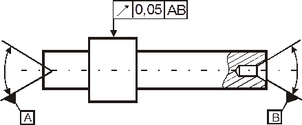 Рис. 3. Указание допуска радиального биения относительно общей оси центровых отверстий. Сделанная на чертеже (рис. 3) условная запись означает, что радиальное биение шейки не должно превышать при изготовлении 0,05 мм относительно оси центров.