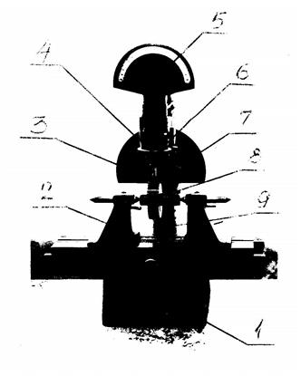 На данном приборе можно проверить биение зубчатого венца у цилиндрических и конических колес с прямым и косым зубом с мелким модулем и частично - средним модулем. Максимальный диаметр проверяемых колес–150 мм. Максимальное расстояние между центрами прибора–280 мм, высота центров–76 мм. Прибор состоит из трех основных частей (рис.3.1): станины, приспособления для установки измеряемых колес и измерительного устройства–ортотеста. На станине 1 имеется винтовая колонна 9, по которой передвигается поворотная державка 3 ортотеста 5. Грубая установка прибора производится с помощью накатной гайки 8. Для точной установки употребляется накатная гайка 4, которой следует пользоваться лишь открепив винт 6. Окончательная настройка прибора на нуль осуществляется поворотом шкалы с помощью рукоятки, расположенной на задней стенке ортотеста.