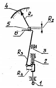 Рис.3.1. Общий вид прибора для контроля радиального биения Ортотест присоединен к державке 3, которая может поворачиваться в сегментных направляющих на угол 900. В зависимости от того, проверяется ли цилиндрическое или коническое зубчатое колесо, ортотест стоит перпендикулярно линии центров или повернут на половину угла конуса колеса. Направление измерения ортотеста, благодаря повороту державки, всегда перпендикулярно зубчатому венцу. Устройство ортотеста заключается в следующем (рис.3.2): при подъеме измерительного наконечника 1 малое плечо рычага, входящее в паз измерительного наконечника и прижимаемое к нему действием пружины 3, будет подниматься вверх. Длинное плечо рычага R3 заканчивается зубчатым сектором 6. Сектор сцепляется с зубчатым колесом 5, сидящем на одной оси со стрелкой 4. Таким образом, перемещение измерительного наконечника 1 вызывает вращение стрелки по шкале. Передаточное отношение прибора определяется следующим образом: