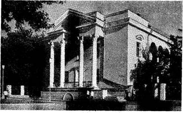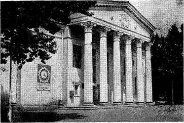 построенного в 1935 — 1940 гг. по проекту архитектора Л. И. Котовского. Объемно-пространственная композиция театра традиционная, с последовательным размещением кассового вестибюля, фойе с гардеробами, буфетами и другими обслуживающими помещениями, которые с трех сторон окружают подковообразный в плане зрительный зал. Далее размещена сценическая часть. Обычную колоннаду на фасаде заменила высокая пятипролетная аркада, которая образует в уровне второго этажа лоджии. Зрительный зал театра имеет 1500 мест; несмотря на большие размеры, в нем средствами архитектуры созданы атмосфера уюта, прекрасная акустика, хорошо просматривается сцена, обеспеченная необходимой механизацией. Административные здания Донецка представляли трехэтажное здание Окружкома (теперь обкома Компартии Украины),