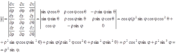 Для представления тройного интеграла в сферических координатах вычисляем Якобиан: