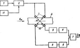 Рис. 3. Структурная схема фазового ультразвукового расходомера. Ультразвуковые колебания, создаваемые генератором 1, модулируются с помощью модулятора 2 и генератора модуляции 11. Модулированные колебания поступают на возбудители 3 двухканального датчика, установленного на трубопроводе 4. Сигналы с приемников ультразвуковых колебаний 10 через усилители 5 и 9, демодуляторы 6 и 8 подаются на фазометр 7, показания которого пропорциональны расходу. Погрешности. Всем ультразвуковым методам измерений расхода присуща методическая погрешность, обусловленная отличием измеряемой этими методами скорости движения среды, осредненной по пути от излучателя до приемника ультразвуковых колебаний, от скорости движения среды, осредненной по площади сечения трубопровода. Рассматриваемая погрешность может быть уменьшена соответствующим выбором соотношения размеров ультразвукового канала и трубопровода с учетом его шероховатости.