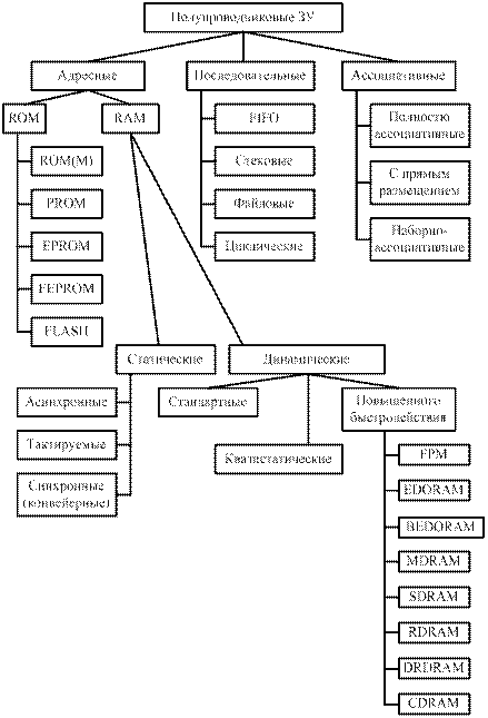 Рисунок 17 – Классификация полупроводниковых ЗУ Статические ОЗУ в 4…5 раз дороже динамических и приблизительно во столько же раз меньше по информационной емкости. Их достоинством является высокое быстродействие, а типичной областью использования – схемы Кэш-памяти. Постоянные ЗУ делятся на следующие разновидности: - постоянные ЗУ типа ROM (M) программируются в процессе изготовления методами интегральной технологии с помощью масок, поэтому их называют масочными. Для потребителя это в полном смысле слова постоянная память, так как изменить ее содержимое он не может; - постоянные ЗУ с однократной записью пользователем – программируемые ПЗУ (PROM). В обозначении присутствует буква P (от Programmable); - репрограммируемые постоянные ЗУ (EPROM и EEPROM), содержимое которых может быть заменено путем стирания старой информации и записи новой. В EPROM стирание выполняется с помощью облучения кристалла ультрафиолетовыми лучами, а в EEPROM – электрическими сигналами. Английские названия расшифровываются как Electrically Programmable ROM и Electrically Erasable Programmable ROM. Программирование PROM и репрограммирование EPROM и EEPROM производятся в обычных лабораторных условиях с помощью либо специальных программаторов, либо специальных режимов без специальных приборов (для EEPROM). Память типа Flash по запоминающему элементу подобна памяти типа EEPROM, но имеет структурные и технологические особенности, позволяющие выделить ее в отдельный вид. Запись данных и для EPROM, и для EEPROM производится электрическими сигналами. В ЗУ с последовательным доступом записываемые данные образуют некоторую очередь. Считывание происходит из очереди слово за словом либо в порядке записи, либо в обратном порядке. Прямой порядок считывания имеет место в буферах FIFO с принципом «первый пришел – первый вышел» (First In – First Out), а также в файловых и циклических ЗУ. Разница между памятью FIFO и файловым ЗУ состоит в том, что в FIFO запись в пустой буфер сразу же становится доступной для чтения, т.е. поступает в конец цепочки. В файловых ЗУ данные поступают в начало цепочки и появляются на выходе после некоторого числа обращений, равного числу элементов в цепочке. При независимости операций считывания и записи фактическое расположение данных в ЗУ на момент считывания не связано с каким-либо внешним признаком. Поэтому записываемые данные объединяют в блоки, обрамляемые специальными символами конца и начала (файлы). Прием данных из файлового ЗУ начинается после обнаружения приемником символа начала блока. В циклических ЗУ слова доступны одно за другим с постоянным периодом, определяемым емкостью памяти. К такому типу среди полупроводниковых ЗУ относится видеопамять (VRAM). Видеопамять работает циклично, на ее выходе последовательно в порядке сканирования экрана монитора лучом появляются коды, задающие параметры светимости (цвет, яркость) элементарных точек экрана – пикселов. Текущее изображение на мониторе, т.е. кадр, представлено последовательностью слов, длина которой равна числу пикселов экрана. Слово, соответствующее одному пикселу, может иметь разрядность от 8 (для черно-белых мониторов) до 24 (для полноцветного режима). Считывание в обратном порядке свойственно стековым ЗУ, для которых реализуется принцип «последний пришел – первый вышел». Такие ЗУ называют буферами LIFO (Last In – First Out). Время доступа к конкретной единице хр