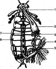 Рис. 28. Схема строения органов таракана: 1 – пищевод; 2 – зоб; 3 – мускулистый желудок; 4 – средняя кишка; 5 – выделительные трубки; 6 – боковые трахеи; 7 – брюшная нервная цепочка. Кровеносная система насекомых в связи с особенностями строения органов дыхания развита слабо и не имеет принципиальных отличий от таковой других членистоногих (рис. 29). Кровь бесцветная или желтоватая, редко красная, что зависит от растворенного в ней гемоглобина (например, у личинок комара-мотыля). Нервная система, как и у других членистоногих, построена по типу окологлоточного нервного кольца и брюшной нервной цепочки. Надглоточный ганглий достигает высокого уровня развития, особенно у общественных насекомых (пчел, муравьев, термитов), преобразуясь в «головной мозг» с тремя отделами: передним, средним и задним. Он иннервирует глаза и усики. Поведение общественных насекомых сложное.