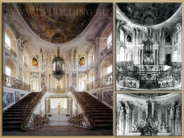 Рис.Лестница в замке Аугустусбург в Брюле около Кельна Особенности рококо — прихотливо изогнутые поверхности, очень сложные лепные и резные узоры, позолота, прихотливые завитки, асимметричные детали, обилие скульптур. Помещения украшаются многочисленными зеркалами. Среди скульптурных сюжетов преобладают мифологические, пасторальные и эротические, а среди орнаментов — раковины, цветочные гирлянды, маски и листья растений. Формы и элементы сочетаются самым причудливым образом, без следования каким-либо правилам. Архитектура стиля рококо отличается легкостью, грациозностью, роскошью и изяществом, при этом она зачастую утрачивает соразмерность деталей.