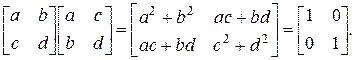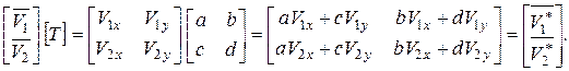 Требуется, чтобы значения векторов, как и угол между ними, оставались постоянными. Сравнивая уравнения (2-42), (2-46) и (2-43), (2-45), а также приравняв коэффициенты подобных членов, получим a2+b2= 1,(2-47a) c2+d2= 1, (2-47b) ac+bd= 0, (2-47c) ad-bc =1. (2-48) Выражения (2-47а, b, с) соответствуют условиям ортогональности матрицы, т.е. [ T ][ T ]-1 = [ T ][ T ] T = [ I ] или