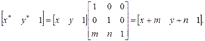 К сожалению, нельзя ввести константы перемещения т и п в (2 х 2)-матрицу преобразования, так как это не пространство! Данное затруднение можно преодолеть, используя однородные координаты. Однородные координаты неоднородного координатного вектора [ х у ]представляют собой тройку [ х' у' h ], где х = х'/h, у = у' / h, а h —некоторое вещественное число. Заметим, что случай h = 0 является особым. Всегда существует один набор однородных координат вида [ х у 1]. Мы выбрали эту форму, чтобы представить координатный вектор [ х у ]на физической плоскости ху. Все остальные однородные координаты представляются в виде [ hx hy h ]. Данные координаты не сохраняют однозначности, например, все следующие координаты [6 4 2], [12 8 4], [3 2 1] представляют физическую точку (3,2). Матрица преобразования для однородных координат имеет размер 3 х 3. В частности,
