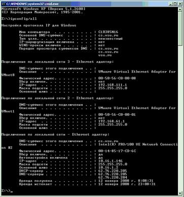 Команда ipconfig/all - отображает полную информацию по всем сетевым адаптерам. Пример вывода для Windows: