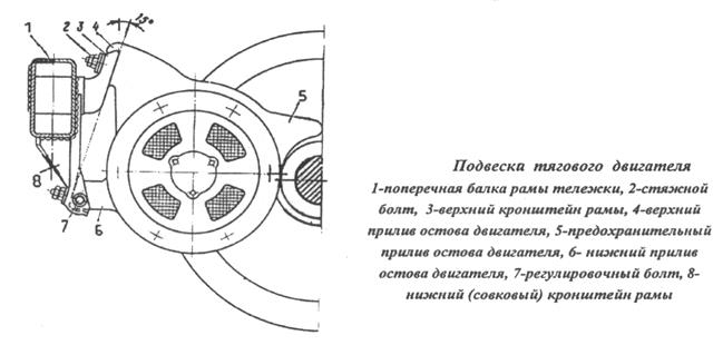 Подвешивание ТД опорно-рамное. На остове двигателя имеются два верхних и один нижний (совковый) приливы, которыми он навешивается на кронштейны поперечной балки рамы тележки. Конструктивно верхние приливы остова и кронштейны рамы выполнены таким образом, что плоскости их прилегания совпадают и фиксируют двигатель на раме. Крепление двигателя осуществляется посредством трех болтов и гаек (гайки шплинтуются). Если в приливах остова цилиндрические отверстия, то в кронштейнах овальные, для возможности перемещения двигателя вдоль оси КП (для регулировки разбега карданной муфты – 4-7 мм). Для перемещения двигателя в боковых стенках нижнего кронштейна имеются резьбовые отверстия под регулировочные болты с контргайками. В качестве предохранительного устройства при изломе верхних кронштейнов на остове двигателя имеются два прилива в виде ребер, которыми двигатель упадет на ось КП. Зазор между осью и этими приливами должен быть по вертикали под тарой вагона не менее 62 мм, по горизонтали между остовом и осью не менее 8 мм.