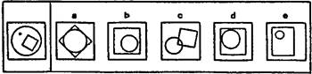 Вторая часть теста состоит, как и первая, из четырех различных групп заданий (отдельных тестов). Они расположены точно так же, как и четыре группы заданий в первой части теста. И здесь каждое задание имеет только одно правильное решение. Ваши ответы отмечайте пожалуйста, на обратной стороне бланка ответов. Нельзя ничего писать на самом тесте! Тест 1 В каждом ряду Вам необходимо выбрать из пяти фигур справа ту, которая наиболее подходит к трем фигурам слева. Вычеркните букву, соответствующую этой фигуре, на Вашем бланке ответов. Примеры 1, 2, 3.