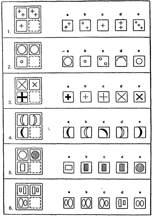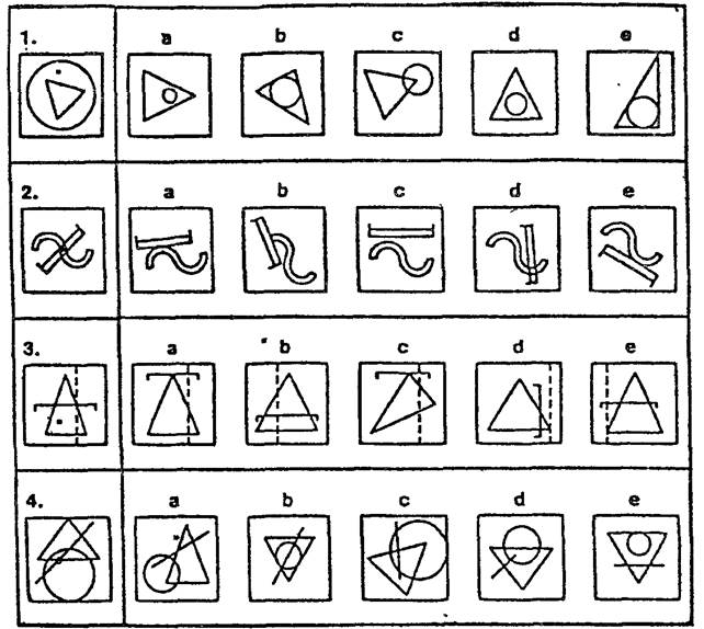 В каждом ряду Вам необходимо выбрать из пяти фигур справа ту, которая наиболее подходит к трем фигурам слева. Вы должны вычеркнуть букву, соответствующую этой фигуре, на вашем бланке ответов.