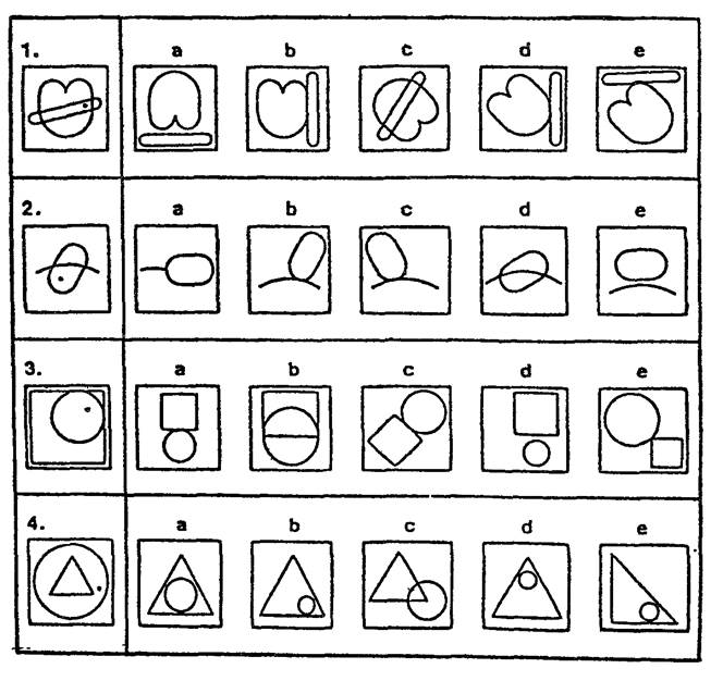 В каждом задании выберите, пожалуйста, справа тот. квадратик с рисунком, который больше подходит на место пустого квадратика слева, чтобы дополнить общий рисунок.