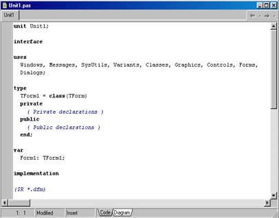 Редактор Кода в Delphi 6 имеет две страницы: Code (код) и Diagram (диаграммы). Закладки этих страниц вы можете видеть в нижней части окна на рис.5. Первая из них (в версиях, младше Delphi 6, только она и имеется) содержит коды модулей вашего приложения и тексты других файлов, которые вы открыли в процессе проектирования. Вторая страница», введенная только в Delphi 6, позволяет вам строить диаграммы, иллюстрирующие взаимоотношения компонентов в вашем приложении. Эта страница является полноценным программным редактором. В редакторе применяется выделением цветом и шрифтом синтаксических элементов. Жирным шрифтом выделяются ключевые слова Object Pascal (на рис.5 вы видите выделение таких слов, ка type, class и др.). Синим курсивом выделяются комментарии (например на рис.5 это комментарий «{Private declarations}»). В заголовке окна Редактора Кода отображается имя текущего файла, того, с текстом которого вы работаете. В верхней части окна вы можете видеть также закладки или ярлычки, указывающие текущую страницу. В нижней части окна Редактора Кода вы можете видеть строку состояния. В самой левой ее позиции находится индикатор строки и колонки. Это помогает вам понимать, в каком месте кода вы находитесь. Второй элемент строки — индикатор модификации. Когда вы начинаете новый проект, то код, который Delphi автоматически написала для вас, еще не сохранен. Вы должны сделать это сами командой File | Save. Если код изменялся вами или Delphi с того момента, когда вы в последний раз сохраняли его в файле, в индикаторе модификации (правее индикатора строки и колонки) появляется слово «Modified». Это слово показывает вам, что код, который вы видите, не тот же самый, что на диске. Третий элемент строки состояния — индикатор режима вставки. Это стандартный индикатор большинства редакторов, который показывает вам, будут ли вводимые символы вставляться в текст или писаться поверх текста. Переключение режима вставки производится клавишей Insert. В окно Редактора Кода, как и в другие окна Delphi, встроена контекстная справка. Чтобы получить справку по какому-то слову кода (ключевому слову, написанному имени функции и т.п.), достаточно установить курсор на это слово и нажать клавишу F1.