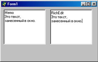 Компоненты Memo и RichEdit (см. пример на рис. 10) являются окнами редактирования многострочного текста. Они снабжены многими функциями, свойственными большинству редакторов.