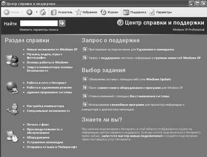 Расширенный поиск Расширенный поиск производится в том случае, если быстрый поиск не дал результатов. При расширенном поиске дополнительно применяются Параметры поиска: • дата; • тип; • размер; • дополнительные параметры. Справочная система в Windows для удобства использования выполнена, как и контекстные меню. В каждом открытом окне приложения Windows вызов справки приведет к выводу на экран того раздела справочной системы Windows, который связан с данным конкретным приложением. Общую же справку можно получить через кнопку Пуск, выбрав команду Справка и поддержка. Появляется окно (рис. 5.3.), где в левой части отображаются разделы справки, а в правой- некоторые дополнительные возможности. Если нажать кнопку Указатель в левой части появившегося окна справки (рис. 5.4.) можно увидеть Фрейм (независимое окно в окне), в