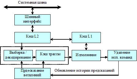 Повышение производительности IA-32 достигалось не только путем оптимизации конвейера команд и добавления исполнительных блоков, но и, например, внедрением кэш-памяти в ядро процессора. В семействе IA-32 встроенный кэш L1 размером 8 Кбайт впервые был реализован в процессорах Intel-486. В процессорах Pentium размер кэша был удвоен. Первые представители P6 (Pentium Pro) содержали также кэш L2 размером 256 или 512 Кбайт. Однако такое решение в то время оказалось слишком дорогим и невыгодным, поэтому в Pentium II была представлена технология Dual Independent Bus (DIB) - двойная независимая шина. Процессор выполнялся в виде картриджа с печатным краевым разъемом, на который выведена системная шина. На картридже размером 14х6,2х1,6см устанавливались микросхема ядра процессора (CPU Core), несколько микросхем, реализующих вторичный кэш, и вспомогательные дискретные элементы (резисторы и конденсаторы). Удаление вторичного кэша из кристалла процессора позволило использовать для кэш-памяти и памяти тегов микросхемы сторонних производителей, специализирующихся на выпуске сверхбыстродействующей памяти. Объем вторичного кэша определялся емкостью и числом установленных микросхем памяти. Для доступа к кэшу и для доступа к внешней памяти использовались раздельные шины. Такое же архитектурное решение использовалось в первых моделях Pentium III. Начиная с 1999 года (Pentium III Coppermine), кэш L2 вновь был возвращен внутрь кристаллов процессоров. Процессор Pentium 4 является 32-разрядным представителем семейства IA-32, по микроархитектуре принадлежащим к новому, седьмому (по классификации Intel) поколению. С программной точки зрения он представляет собой процессор IA-32 с очередным расширением системы команд - SSE2. По набору программно-доступных регистров Pentium 4 повторяет процессор Pentium III. С внешней, аппаратной точки зрения - это процессор с системной шиной нового типа, в которой кроме повышения тактовой частоты применены ставшие уже привычными принципы двойной (2х) и четырехкратной (4х) синхронизации, а также предпринят ряд мер по обеспечению работоспособности на ранее немыслимых частотах. Микроархитектура процессора, получившая название NetBurst, разработана с учетом высоких частот как ядра (>1,4 ГГц), так и системной шины (400 МГц). Название микроархитектуры указывает на сетевую направленность процессора: его мощь необходима для ресурсоемких мультимедийных Интернет-приложений. Процессор Pentium 4 является однокристальным. Кроме собственно вычислительного ядра, он содержит кэш-память двух уровней. Вторичный кэш, общий для инструкций и данных, имеет размер 256 Кбайт и разрядность шины 256 бита (32 байта), как и в последних процессорах Pentium III. Шина вторичного кэша работает на частоте ядра, что обеспечивает ее пропускную способность 32х1,4 = 44,8 Гбайт/с на частоте 1,4 ГГц. Вторичный кэш имеет ЕСС-контроль, позволяющий обнаруживать и исправлять ошибки. Первичный кэш данных имеет такую же высокую пропускную способность (44,8 Гбайт/с), но его объем сократился вдвое (8 Кбайт против 16 в Pentium III). Первичный кэш инструкций в привычном понимании отсутствует, его заменил кэш трассы (trace cache). В нем хранятся последовательности микроопераций, в которые декодированы инструкции. Здесь могут помещаться до 12К микроинструкций. Интерфейс системной шины процессора рассчитан только на однопроцессорные конфигурации, отсутствует также возможность избыточ