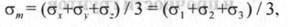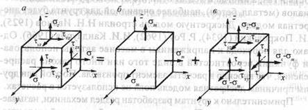 Рис. 2.1. Разложение тензора напряжений (а) на шаровой (б) и девиатор напряжений (в) Шаровой тензор напряжений характеризуется средними напряжениями: