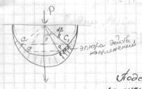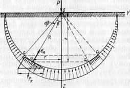 34.Из каких условий определяется безразмерный коэффициент в формуле для σR в задаче о сосредоточенной силе на полупространстве? Из условия равновесия при проектировании всех сил на вертикальную ось. Вырезается полусфера и на вертикальную ось проектируются все напряжения σR, умноженные на элементарные площадки (чтобы получить элементарные силы). Эти проекции должны уравновешиваться силой, действующей сверху вниз на полупространство В данном случае берется не полусфера, как в пространственной задаче, а полукольцо. (см. 6)