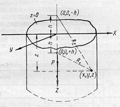 Рис. 6.7. Схема действия сосредоточенной силы внутри массива грунта.