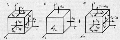 Угол α называется углом видимости, поскольку если мы поместим в рассматриваемую точку полуплоскости глаз наблюдателя, то под этим углом мы как бы видим нагрузку. Рассчитанные таким образом величины представлены на рис. 6.11 - в виде линий равных напряжений (изолиний напряжений). Видно, что по мере удаления от поверхности загружения интенсивность напряжений уменьшается и стремится к нулю. Вертикальные сжимающие напряжения σz распространяются преимущественно в глубь основания, горизонтальные сжимающие напряжения σx - в стороны от полосы загружения. Касательные напряжения τxz концентрируются по преимуществу под краями загруженной полосы. 44.Какие напряжения называются главными нормальными напряжениями? Сколько главных напряжений в плоской и сколько в пространственной задачах?