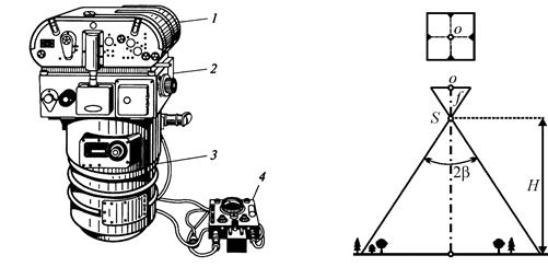 Рис. 12.1 Аэрофотоаппарат: а – устройство: 1 – кассета; 2 – камерная часть; 3 – часть объектива; 4 – командный прибор; б – схема фотосъемки: S – центр проектирования снимка; f – фокусное расстояние; H – высота фотографирования Аэрофотоснимок, угол наклона которого при фотографировании был равен нулю, называется горизонтальным, при угле наклона, не превышающем 3°, - плановым, при угле наклона более 3° - перспективным. Различают аэрофотосъемку одинарную - это съемка отдельных объектов, маршрутную - фотографирование полосы местности вдоль заданной линии (например, железной дороги) и площадную - фотографирование местности несколькими параллельными маршрутами. Фотографирование выполняют так, чтобы смежные снимки одного маршрута имели продольное перекрытие не менее 60%, а снимки соседних маршрутов – поперечное перекрытие не менее 30%. Аэрофотоснимок представляет собой центральную проекцию точек местности на плоскость снимка (см. рис. 12.1, б). Масштаб горизонтального снимка определяется по формуле