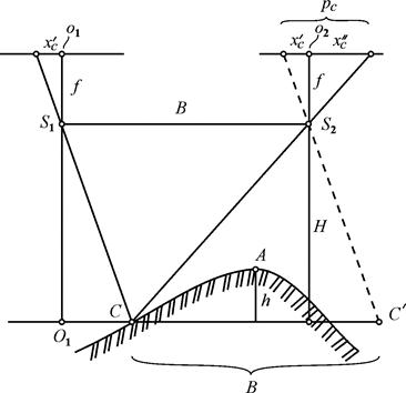 где H – высота фотографирования; f – фокусное расстояние аэрофотоаппарата. За начало локальных координат принята проекция O 1 точки S 1 на исходную уровенную поверхность. Превышения между точками местности вычисляют по разностям их продольных параллаксов. Продольным параллаксом pc точки c называется разность абсцисс ее изображений на левом и правом снимках стереопары: pc = Аналогично для точки A: pa = Из рис. 12.5 видно, что