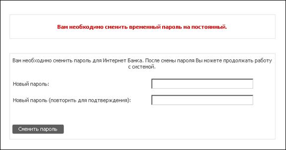 После ввода Логина и временного пароля система предлагает сменить временный пароль на постоянный. После успешного ввода Логина и Пароля и нажатия на кнопку "Вход", Клиенту будет выслан одноразовый пароль, высылаемый по SMS на номер мобильного телефона, указанный Клиентом при подключении Альфа-Клик, который необходимо ввести в новом окне: