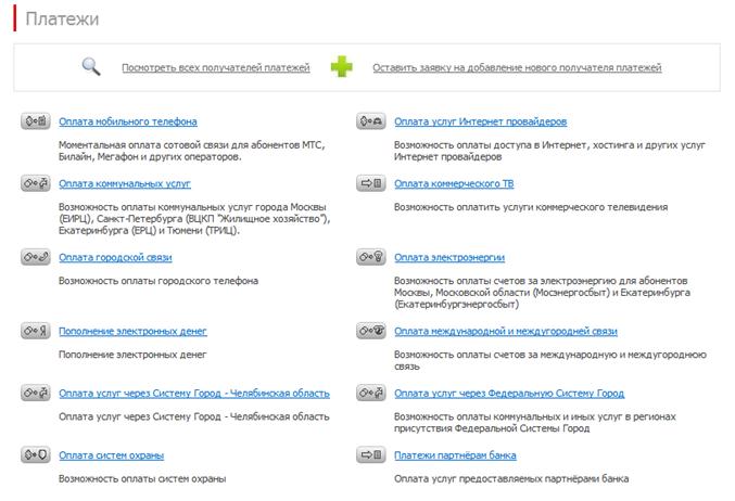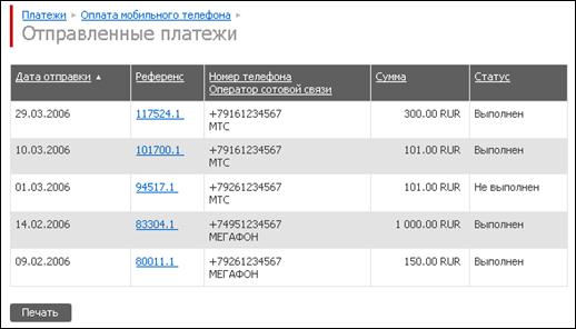 История платежей представляет собой список отправленных платежей или переводов данного типа (к примеру, список внешних переводов или платежей за мобильную связь) с краткой информацией по переводу и статусом платежа: