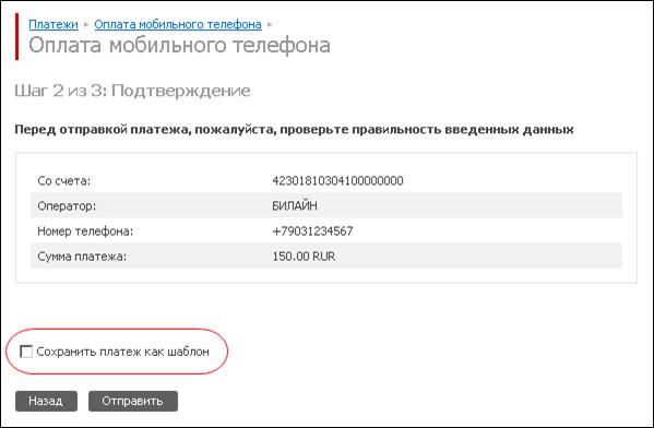Для того чтобы сделать шаблон необходимо: 1. Заполнить форму и нажать кнопку «продолжить»; 2. На шаге 2 (подтверждение платежа) поставьте галочку «Сохранить как шаблон» - данные сделанного Вами платежа будут запомнены для дальнейшего использования: