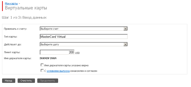 2. Заказ виртуальной карты. Шаг 1. Необходимо выбрать из выпадающего списка: · Привязать к счету - выберите счет, с которого будете осуществлять платежи; · Действует до – выберите срок действия виртуальной карты; · Лимит карты – выберите максимально доступный лимит средств для виртуальной карты (Лимит устанавливается в долларах США по курсу платежной системы Mastercard, что примерно равно курсу ЦБ РФ).