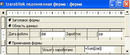 End Sub А потім в коді на подію Load форми надати властивості Caption значення аргументу OpenArgs Private Sub Form_Load() Me.Caption = OpenArgs Ø ShowAllRecords – відміняє дію будь-якого фільтру в активній таблиці або наборі записів, виконує повторний запит і забезпечує виведення всіх записів (і нових також); метод не має аргументів. Ø OpenDataAccessPage – відкриває сторінку доступу до даних; має 2 аргументи: ім’я сторінки (DataAccessPageName) – обов’язковий параметр та режим (View); за замовчанням встановлює режим перегляду (acDataAccessPageBrowse), можливий і режим конструктора (acDataAccessPageDesign). Ø OpenQuery – відкриває запит, ім’я якого вказувати обов’язково. Ø OpenReport – відкриває звіт із вказаним ім’ям. Задача 4.2 Створити послідовність форм для пошуку відомостей про заробітки певного робітника. Пошук здійснювати за прізвищем або за табельним номером. Спочатку створимо за допомогою майстра форм підпорядковану форму, яка буде відображувати відомості про заробітки. Виберемо для форми тип Режим таблицы. Включимо до форми поля dat і zar (дата роботи і заробіток) таблиці tzarobitok і встановимо порядок сортування за датою. В розділі Примечание формы для обчислення загальної суми заробітків розмістимо Поле 1та встановимо для нього властивість Данные = Sum ([ zar ]). Конструктор форми зображений на рис. 4.1.