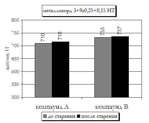 Причиной «предпочтительного» поведения латунного покрытия с низкой долей меди является меньшая скорость образования Cu2-xS, что позволяет упорядочить возникающие при этом сульфидные связи между компаундом и поверхностью корда. Толщина сульфидного слоя, в общем, немного увеличивается. Это приводит к тому, что первоначальная адгезия, в общем, несколько ниже, чем у корда с покрытием с высоким содержанием меди, но данные «упорядоченные» сульфидные связи меньше подвержены вредному воздействию влаги при паровом и солевом старении. Влияние состава компаунда на сохранение адгезии на нашем заводе изучено еще недостаточно. В одной из исследовательских работ были получены интересные результаты, демонстрирующие положительное влияние компаунда на сохранение адгезионных свойств при старении (рисунок 7).