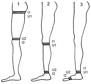 Регистрация РВГ РЕОВАЗОГРАФИЯ Реовазография - метод исследования интенсивности периферического кровообращения, оценки состояния сосудистого тонуса, выраженности коллатерального кровообращения, оценки состояния венозной системы. При регистрации РВГ необходимо соблюдать следующие условия: 1. Исследование проводится натощак или через несколько часов после еды. 2. Запись должна осуществляться в отдельном помещении, исключающем возможность воздействия посторонних раздражителей, при температуре окружающего воздуха не ниже +20 градусов по Цельсию, чтобы не вызвать сосудистых реакций. 3. Больной должен находиться в удобной позе лежа. 4. Во время записи необходим визуальный контроль качества регистрируемых реограмм для своевременного устранения артефактов. 5. Усиление сигнала желательно подобрать таким, чтобы при амплитуде калибровки в 0,1 Ом размах калибровки на бумаге был бы не менее 10 мм. 6. Рекомендуемая скорость лентопротяжки - не менее 25 - 30 мм/с. 7. Частота зондирующего тока 30 - 150 кГц, желательно одинаковая во всех отведениях. Наиболее часто в клинической практике используют продольные отведения РВГ (Рис. 10, а; б). Реовазограммы регистрируют на различных участках верхних и нижних конечностей: плечо, предплечье, кисть, пальцы, бедро, голень, стопа, пальцы стоп.