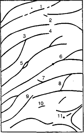 Рис. Частные признаки (детали) папиллярных линий: короткая линия и точка (1), пере- рыв (2), соединение линий (3), окончание линий (4), глазок (5), разветвление линий (6), крючок (7), мостик (8), встречное положениепапиллярных линий (9), обрывок (10), особен- ности строения дельты (11) Признаки папиллярных узоров делят на общие и частные (детали). По общим признакам эти узоры делят на дуговые, петлевые, завитковые. Дуговые узоры наиболее просты по своему строению и встречаются относительно редко (около 5% от общего количества). Петлевые узоры наиболее распространены и составляют около 65% от общего количества узоров. Завитковые узоры встречаются у 30-35% от общего количества. Важной задачей нарядов милиции на месте происшествия является сохранение следов рук преступника. Для сохранения следов рук преступника следует удалить с места происшествия всех посторонних, не нарушать обстановку, ни к чему не прикасаться, не разрешать производить уборку, стараться не оставлять своих следов, не уничтожать имеющиеся следы. Следы необходимо сохранять от атмосферных осадков: дождя, снега. Прямые солнечные лучи также губительно влияют на потожировые следы. Поэтому необходимо закрыть предметы, на которых могут быть обнаружены следы рук, подручными средствами: куском жести, фанеры, доской и т.п.