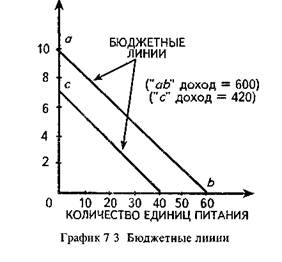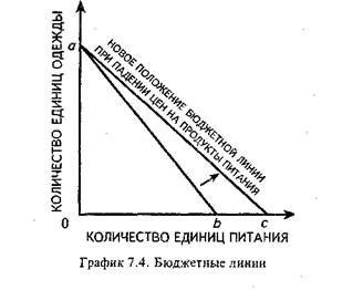 Если доход потребителя снизится (например, до 420 долл.), то бюджетная линия сместится параллельно и вниз (см. график 7.3) и займет положение «с». При увеличении же дохода потребителя бюджетная линия сместится параллельно вверх. Изменение уровня цен может по-разному повлиять на положение бюджетной линии. Если цены на оба товара будут пропорционально возрастать, то бюджетная линия сместится параллельно и вниз, ибо такое поведение цен равнозначно снижению дохода потребителя. Наоборот, если цены на оба товара упадут, то это будет означать как бы рост дохода потребителя и бюджетная линия сместится параллельно вверх. Наиболее вероятен, однако, вариант, когда цены на товары будут меняться по отношению друг к другу. Предположим, что цены на одежду не меняются, а продукты питания становятся дешевле. В этом случае «X» при той же величине приобретаемых единиц одежды может покупать большее количество единиц питания. В этом случае бюджетная линия изменит свой наклон и вместо исходного положения «аЬ» займет положение «ас», как это показано на графике 7.4.