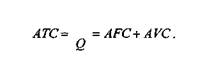 Средние общие, или валовые, издержки определяют делением суммы общих издержек (ТС) на объем произведенной продукции или сложением средних постоянных и средних переменных издержек для любого из возможных объемов производства: ТС ^ Средние общие издержки при малых объемах производства снижаются, достигают минимального значения при оптимальном объеме выпуска и далее с ростом выпуска начинают увеличиваться. Такая закономерность изменения общих средних затрат предопределяется характером изменения средних постоянных и средних переменных затрат. На рис. 22.2 такая зависимость представлена кривой А ТС. Общие затраты для каждого объема выпуска (колонка 4) получаем, суммируя постоянные и переменные затраты фирмы (колонка 2 плюс колонка 3). Средние постоянные затраты определяем делением постоянных затрат (колонка 2) на выпуск (колонка 1). Средние переменные затраты определяем делением переменных затрат (колонка 3) на выпуск (колонка 1). Средние общие затраты определяются делением общих затрат (колонка 4) на выпуск (колонка 1). Предельные издержки, например 2-й единицы продукта, равны разности общих издержек производства двух изделий (колонка 4) и общих издержек производства одного изделия (колонка 4), и так для каждой доследующей единицы изделия. Средние общие издержки сравнивают с ценой продукта. Если цена больше средних общих издержек, фирма получает экономическую прибыль; если цена меньше средних общих издержек, фирма терпит убытки. Если цена продукции равна средним общим издержкам, то фирма находится в состоянии равновесия, не получает ни прибыли, ни убытков, ее выручка равна общим издержкам Таблица 23.1