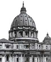 Но более всего удивляет лестница вестибюля. По остроумному замечанию Я. Буркхардта «она пригодна только для тех, кто хочет сломать себе шею». По сторонам, где это необходимо, у лестницы нет перил. Зато они есть в середине, но слишком низкие, чтобы на них можно было опереться. Крайние ступени закруглены с совершенно бесполезными завитками на углах. Сама по себе лестница заполняет почти все свободное пространство вестибюля, что вообще противоречит здравому смыслу, она не приглашает, а лишь загораживает вход. В проекте собора Св. Петра (1546) Микеланжело в противоречие начавшему строительство Браманте, подчинил все архитектурное пространство центральному куполу, сделав сооружение динамичным. Пучки пилястров, сдвоенные колонны, ребра купола изображают согласованное, мощное движение ввысь. В сравнении с эскизами Микеланжело, исполнитель проекта Джакомо делла Порта в 1588- 1590 гг. усилил эту динамику заострив купол; он сделал его не полусферическим, как было принято в искусстве Возрождения, а удлиненным, параболическим. Тем самым был отменен классицистический идеал равновесия, в котором зрительная устремленность снизу вверх как бы гасилась статичностью полуциркульной формы. Новый силуэт подчеркнул мощное движение ввысь, к небу.
