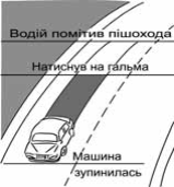 Автомашини — це головна небезпека в місті, і тому кожен пішохід повинен твердо знати основні пішохідні правила, що допоможуть йому не потрапити під колеса. Серед усіх видів транспорту найбільшою популярністю користується автомобільний. І це не дивно. Адже автомобіль не «прив’язаний» до рейок, як залізничний транспорт, він набагато дешевший за повітряний. Взагалі, автомобіль — це сусід кожного жителя міста, але сусід дуже небезпечний. 2. Р обота за підручником (С. 115–117) — Як ви вважаєте, чому вам постійно нагадують, щоб ви не затримувалися на проїжджій частині дороги? — Як ви вважаєте, чому вам постійно нагадують, щоб ви не вибігали на дорогу з-за будинку, машини, що стоїть? — Чому слід уникати «зустрічі» з машиною? — Чому миттєво зупинити машину навіть досвідченому водієві не вдається? — Що відбувається, коли водій побачив на дорозі пішохода? — Чому під час гальмування відстань між пішоходом та автомобілем швидко скорочується? — Чому, коли водій тисне на педаль гальма, машина не зупиняється, а проїжджає ще певну відстань і зупиняється? — Як називається відстань, яку проїжджає машина від початку гальмування до місця зупинки машини? — Що таке гальмо? — Розгляньте малюнок на с. 116. Розкажіть за малюнком, що називають гальмівним шляхом. — Чому зупинити машину миттєво не можна? — Розгляньте таблицю в підручнику. — Від чого залежить довжина гальмівного шляху? — Коли у машини коротший гальмівний шлях? — Коли у машини довший гальмівний шлях? — Що впливає на довжину гальмівного шляху автомобіля? — Розгляньте верхні малюнки на с. 117. Чому довжина гальмівного шляху машин різна? — Від чого ще залежить довжина гальмівного шляху машини? — Що могло трапитись з пішоходом, коли машина гальмує слизькій дорозі? — Розгляньте нижній малюнок. Які машини на ньому зображено? — Яким буде гальмівний шлях кожної з машин, якщо вони рухаються з однаковою швидкістю по сухій дорозі? Учитель. Зі швидкістю 80 км/год на шосе, вкритому ожеледдю, машина повністю зупиниться лише через 400 м після того, як водій почне гальмувати. Ось чому дорогу треба переходити обережно, не бігти напереріз машинам, не вибігати на дорогу з-за будинків, машин чи інших перешкод. 3. Фізкультхвилинка 4. Робота в зошиті (С. 44) 1) № 3. Визначте, у яких випадках гальмівний шлях буде довгим, а в яких — коротким. Поясніть чому. а) Дорога суха, шини автомобіля нові, добре освітлення; б) йде сильний дощ; в) водій стомлений, видимість погана; г) автомобіль їде з великою швидкістю, шини автомобіля стерті. 2) № 4. Практична робота «Встановлення гальмівного шляху автомобіля залежно від швидкості, погодних умов». 1. Розгляньте малюнок. Поясніть, що таке гальмівний і зупинний шлях автомобіля.