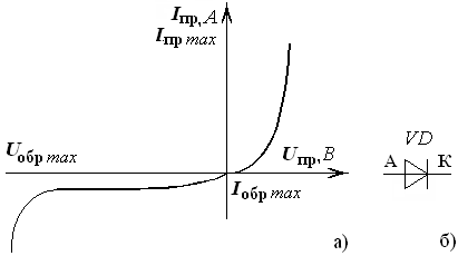 Выпрямительные диоды имеют одностороннюю проводимость тока за счет применения полупроводниковой структуры с двумя слоями. Один обладает дырочной p электропроводностью (основные носители заряда дырки), а другой — электронной n (основные носители заряда электроны) электропроводностью. На участке раздела p и n -слоев, образуется электронно-дырочный переход (p - п переход). Это область, обедненная носителями зарядов. На ее границах появляется контактная разница потенциалов. Внешнее напряжение, в зависимости от полярности, может или открыть переход, или увеличить разницу потенциалов, препятствуя прохождению основных носителей зарядов. Выпрямительные свойства полупроводникового диода и его вольтамперная характеристика связаны с процессами в p - п переходе при подключении внешнего напряжения. Вольтамперная характеристика полупроводникового диода приведена на рис. 1, а. Прямой ток диода создается основными, а обратный – не основными носителями заряда.