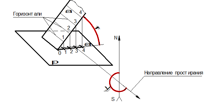 Рис. 41 Плоскость в проекциях с числовыми отметками φ – угол падения плоскости (угол между линией ската и ее проекцией). В случаях, когда ориентируют плоскость относительно стран света, пользуются направлением простирания и углом падения. Направлением простирания плоскости считается правое направление горизонталей, если смотреть в сторону возрастания отметок. Углом простирания ψ называется угол, измеряемый в горизонтальной плоскости против хода часовой стрелки, от северного конца до направления простирания плоскости. Задача. Определить угол наклона плоскости α(1,0; 3,0;4,3,0) к плоскости нулевого уровня. Определить направление простирания и угол простирания (рис. 42).