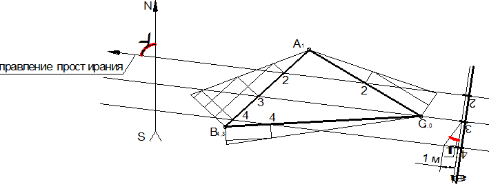 Рис. 42 Определение направления простирания и угла простирания Методические указания. Градуируем прямые AB, AC и BC. Соединением одинаковых отметок получаем горизонтали плоскости. Строим перпендикулярно горизонталям в любом месте масштаб падения плоскости αi. Откладываем от него по горизонтали 1 м и соединяем с ближайшей горизонталью. Определяем φ – угол наклона плоскости к плоскости нулевого уровня. Определяем направление простирания и угол простирания плоскости в соответствии с вышеописанными определениями.