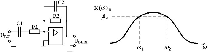 а б Рис. 4.24. Схема ФПП с вещественными полюсами (а), АЧХ (б) Передаточная функция: Если частоты среза определяются как Если частоты среза определяются как то коэффициент передачи: