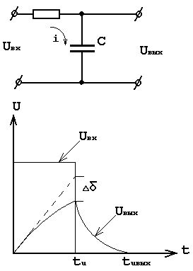 Интегратор. Интегрирующие цепи предназначены для интегрирования во времени электрических входных сигналов. Величина входного сигнала в общем виде описывается уравнением Uвх(t)= Uвых(0) + K Uвых(0) - начальное значение выходного сигнала в момент времени t = 0, К - коэффициент пропорциональности. Простейшей пассивной линейной интегрирующей цепью является чeтыpexпoлюcник, состаящий из RC - элементов.