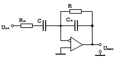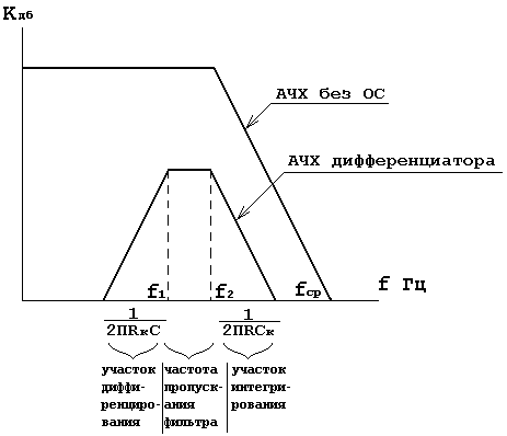 Конденсатор Ск выбирается так, чтобы участок АЧХ со спадом 6 дб/окт начинался на частоте более высокой, чем максимальная частота полезного дифференцированного сигнала. Уменьшается доля ВЧ шумов в выходном сигнале. Этот участок начинается на частоте F2 = Сопротивление Rк ограничивает коэффициент усиления на BЧ, обеспечивает динамическую устойчивость. Частотная характериcтика скорректированного дифференциатора приведена на рис. 2.15