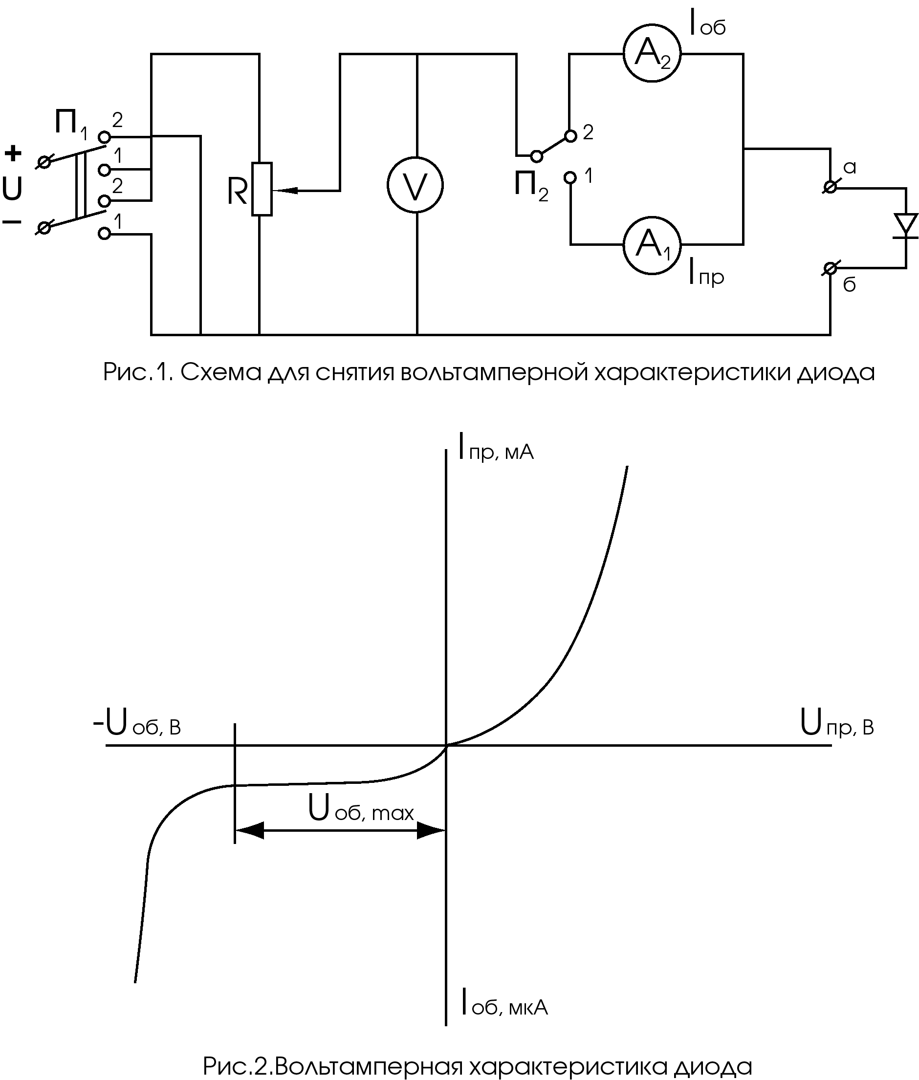 Рис. 7. Вольтампермерная характеристика диода Вольтамперная характеристика (ВАХ) - это зависимость электрического тока, протекающего через диод от напряжения, приложенного к диоду. Прямой ток резко растет при небольших положительных напряжениях (UnpB). Но этот ток не должен превышать максимального значения, т.к. в противном случае произойдет перегрев диода и он выйдет из строя. Максимальное обратное напряжение определяется конструкцией диода и находится в интервале 10В ÷ 10кВ.
