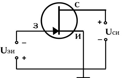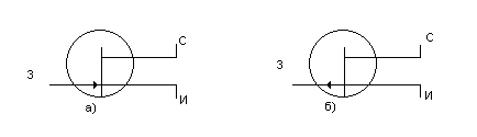 Рис. 2. Условное графическое обозначение полевого транзистора с управляющим p-n переходом с каналом n -типа (а), p -типа (б). Полевой транзистор с управляющим p-n переходом выполнен в виде пластины из полупроводника n -или p -типа рис.1(в данном случае рассматривается полупроводник n -типа). На гранях этой пластины созданы области p -типа электропроводности (3) и в результате образуются p-n переходы, а контакты областей «3» соеденены между собой. Объем пластины, расположенный между p-n переходом является каналом полевого транзистора. Если приложить к затвору отрицательное напряжение, то происходит обеднение электронами (основные носители) участков канала, примыкающих к затвору, ширина p-n перехода возрастает и увеличивается его сопротивление. Таким образом происходит управление сопротивлением канала. В том случае, если канал полевого транзистора p -типа, то при подаче положительного напряжения между затвором и истоком p-n переход расширяется и уменьшается толщина канала и, следовательно, увеличивает его сопротивление. Полевой транзистор с управляющим p-n переходом (канал n-типа) оказывается запертым (Iс=0) при обратном напряжении, которое называется напряжением отсечки Uзиотс. В этом случае p-n переходы сливаются и ток через канал не проходит. Напряжение насыщения: Uси(нас) = /Uзи(отс)/-/Uзи/…………………………………………………….(1). Режим, когда Uси>=Uсиз называется режимом насыщения и рост тока Iс прекращается при увеличении Uси. Полевые транзисторы имеют три схемы включения с общим истоком (ОИ) (а), общим стоком (ОС) (б) и с общим затвором (ОЗ) с каналом n-типа. Наиболее часто используемой схемой включения применяется схема с ОИ (рис.3).