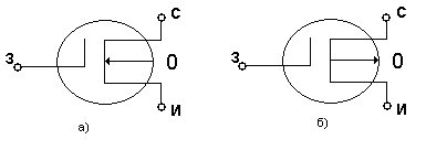 Рис. 7. Условное графическое изображение МДП транзисторов со встроенным каналом n-типа (а), p-типа (б) Схема выключения МДП-транзисторов показана на рисунке 8 (а,б,в):