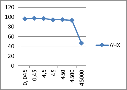 Контрольные вопросы Построить амплитудно-частотную характеристику(АХЧ). Полученные данные занести в таблицу3. Повторить аналогичные измерения при том же значении входного напряжения,изменяя подекадно его частоту.Все полученные данные занести в таблицу 4. ПРИМЕР 1. Таблица3