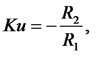 Усилитель охвачен отрицательной обработкой связью через R2 между выходом и инвертирующим входом. Допустим, что входное сопротивление усилителя велико Rвх-0, а Rвых-0, то при большом коэффициенте усилителя (К0=105) Iвх=Iвых и находятся как Iвх= и Iвых= . Коэффициент усиления по напряжению с учетом обратной связи равен (6)