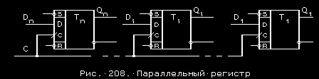 3. Регистры - это устройства, выполняющие функции приема, хранения и передачи информации в виде т-разрядного двоичного кода. Основным классификационным признаком регистров являются способ записи двоичного кода в регистр и его выдача, т.е. различают параллельные, последовательные (сдвигающие) и параллельно-последовательные регистры. Параллельный регистр выполняет операцию записи параллельным кодом. Последовательный регистр осуществляет запись последовательным кодом, начиная с младшего или старшего разряда, путем последовательного сдвига кода тактирующими импульсами. Параллельно-последовательные регистры имеют входы как для параллельной, так и для последовательной записи кода числа. Кроме того, сдвигающие регистры делятся на одно- и двунаправленные (реверсивные). Однонаправленные регистры осуществляют сдвиг кода влево или вправо,а двунаправленные - и влево, и вправо. Основой построения регистров являются синхронные RS-триггеры или, предпочтительнее, В-триггеры. Принцип построения простейшего параллельного т-разрядного регистра показан на рис. 208.